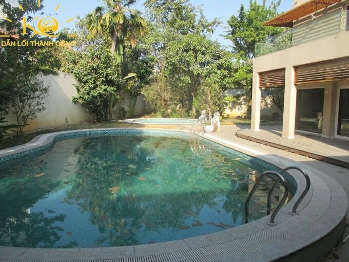 Khuôn viên trước của biệt thự cho thuê có hồ bơi cộng với nhiều cây xanh xung quanh tạo không gian sống trong lành, cảm giác mát mẻ vào mùa hè.