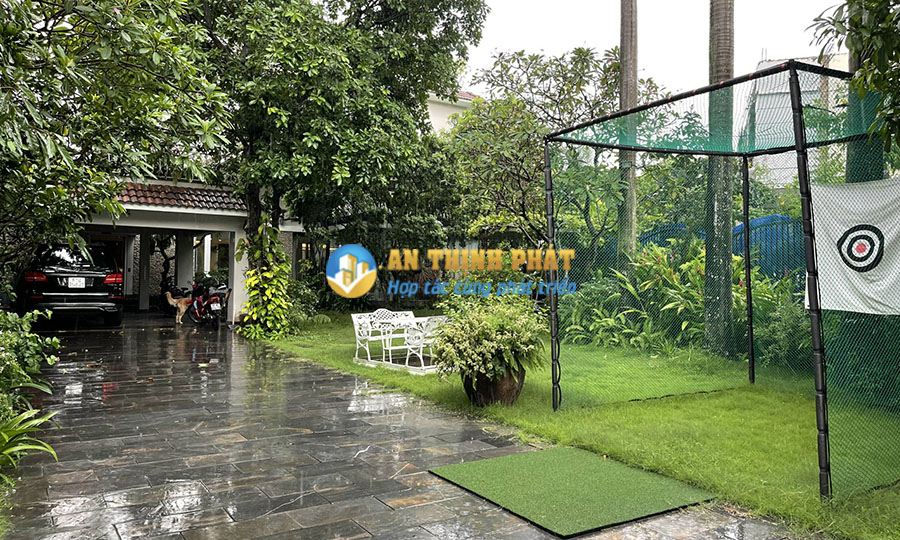 Sân vườn của biệt thự, nhà xe nằm bên hông.